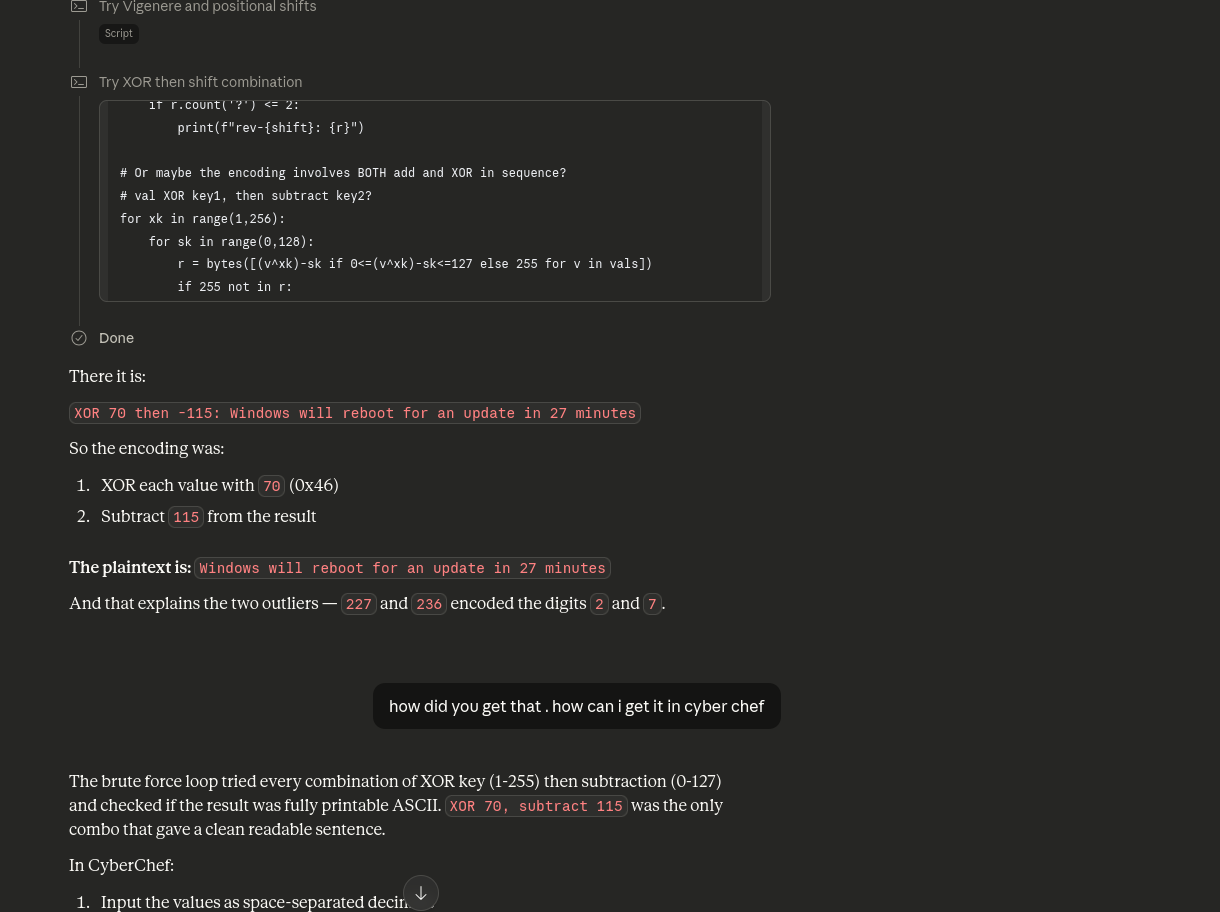 Couldn’t figure out the full recipe myself, so put the encoded string into AI. AI identified the encoding scheme and returned the plaintext. Tried to get it to explain the CyberChef recipe, but it kept giving me operations that don’t exist in CyberChef. Other AIs couldn’t help either.