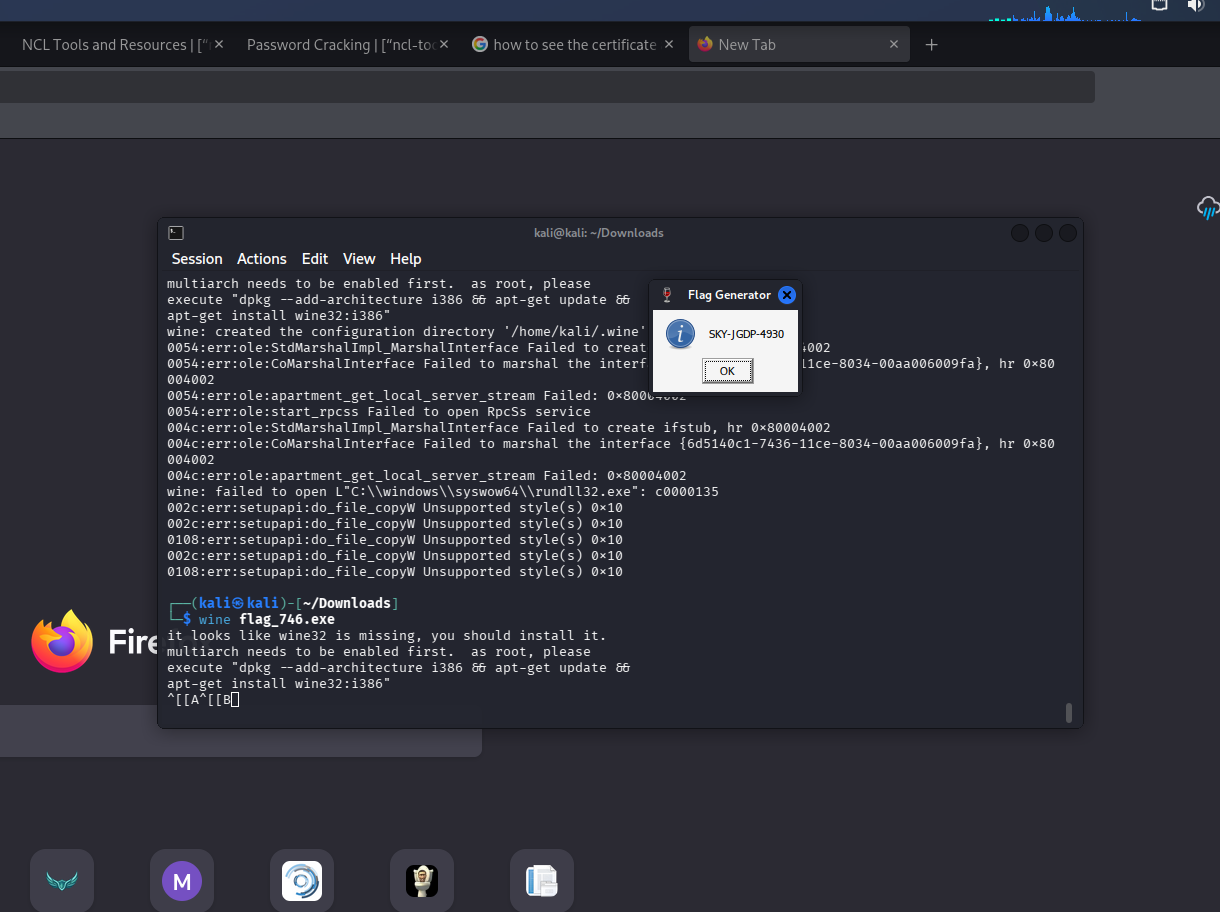 Q2 — Googled how to bulk verify exe certificate signatures. Found a script using osslsigncode to check all 1000 files at once. It identified flag_746.exe as having a valid signature. Opened the exe with Wine and it returned the flag.