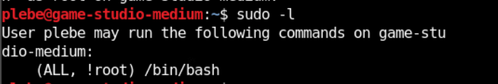Ran sudo -l to check what was allowed. Saw that /bin/bash could be run as any user except root (the !root flag).