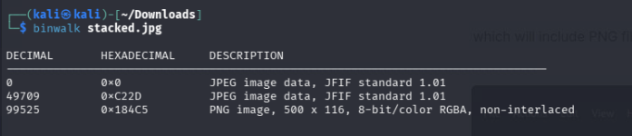 Downloaded the file. Ran binwalk stacked.jpg to inspect what was hidden inside — it showed a JPEG and an embedded PNG file.