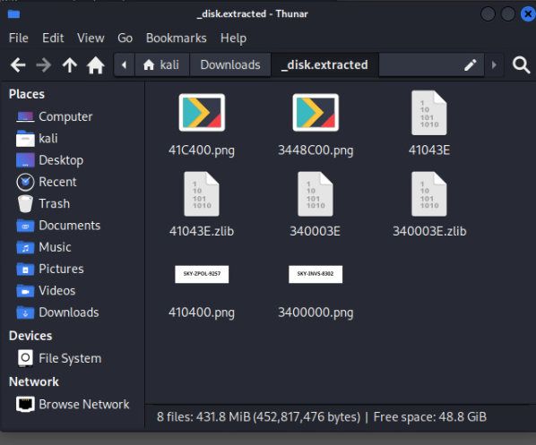 Downloaded disk.gz and extracted it. Ran binwalk on the disk image — it returned several extracted files, two of which contained the flags directly (Q7 and Q8).