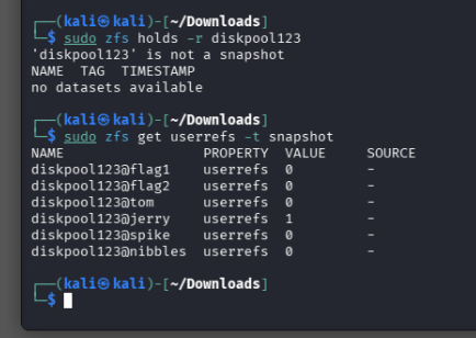 For the protected snapshot, ran a zfs holds command which confirmed diskpool123@jerry had a hold preventing deletion.