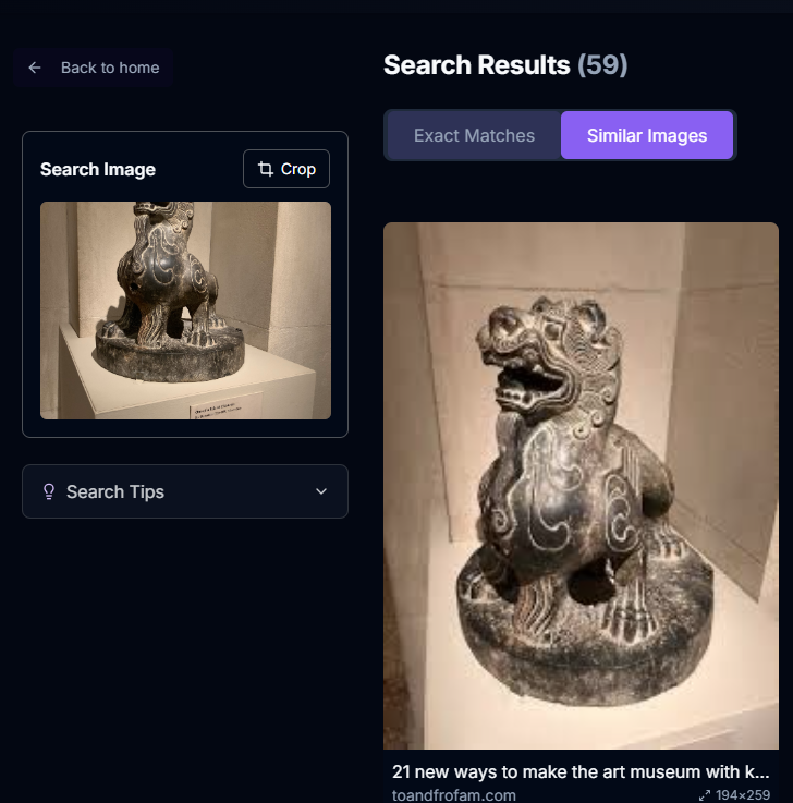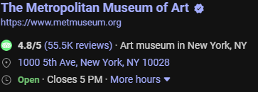 Switched approach — looked up the text on the sign in the image directly. This brought me to the Metropolitan Museum of Art collection page for that specific artifact. The museum’s address is 1000 5th Ave, New York, NY 10028.