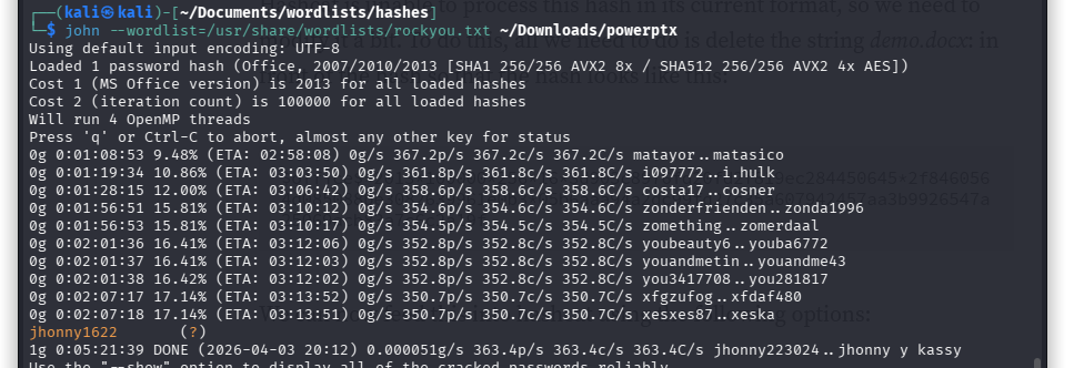 Ran john with the rockyou wordlist to crack it. Left it running — it took about 2 days because I forgot about it. Came back and it had found the password: jhonny1622.