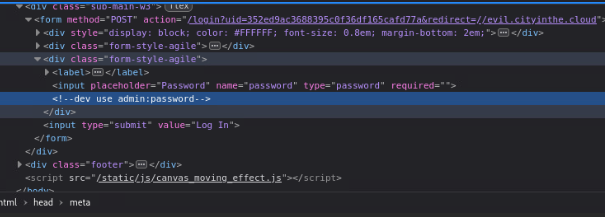 Q4 — Inspected the login button in DevTools and found the POST request included a redirect parameter. This is an open redirect vulnerability — the server doesn’t validate where it redirects to after login.