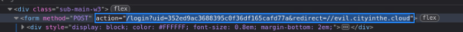 Crafted the exploit URL by passing //evil.cityinthe.cloud as the redirect value. Anyone who visits the URL and clicks login will be sent to the attacker’s site.